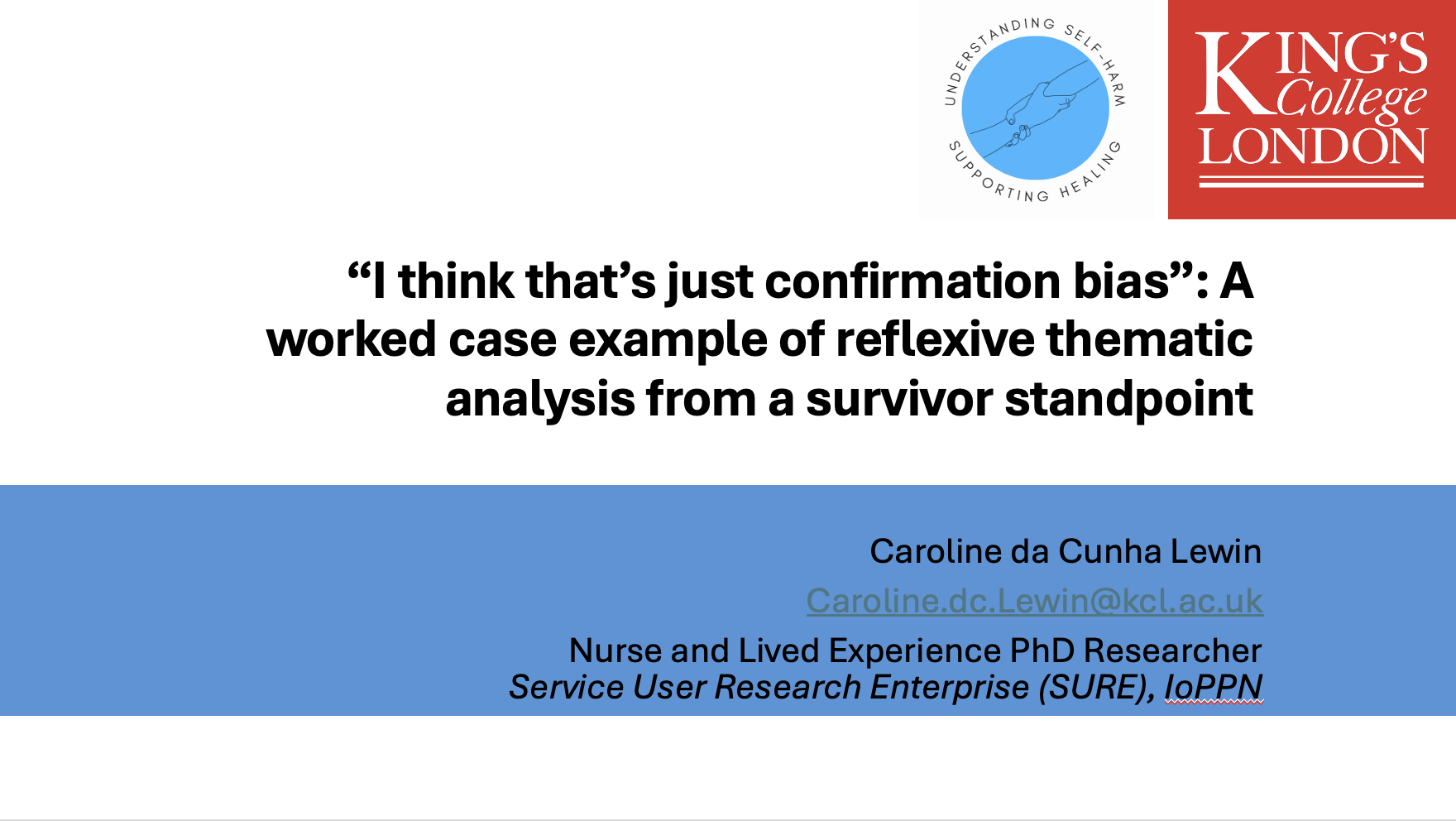 Caroline C. Da Cunha Lewin (she/they) is a lived experience researcher and general nurse undertaking their doctorate in Health Service and Population Research, specialising in self-harm. Her work specifically uses qualitative methodology to consider the lived experience interpretation of self-harm. Other research interests include participatory methodology, social and trauma-informed understandings of mental distress and reflexivity in qualitative methods.